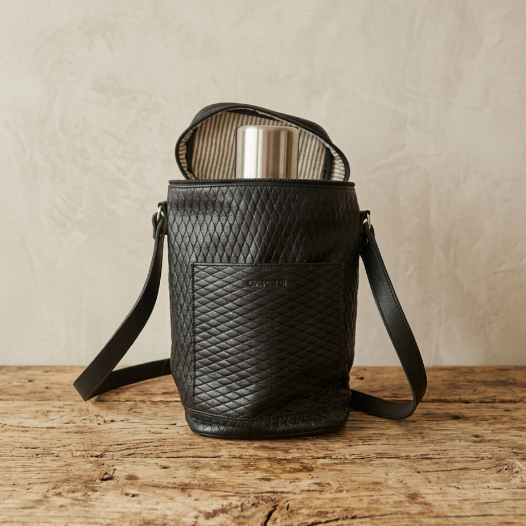 Este bolso matero de cuero negro es el accesorio ideal para los amantes del mate que buscan aventura. Resistente y duradero, te acompañará en tus viajes, excursiones y escapadas al río. Su diseño compacto y su correa lo hacen perfecto para llevarlo a cualquier lado. ¡Disfruta de tu mate en cualquier lugar!