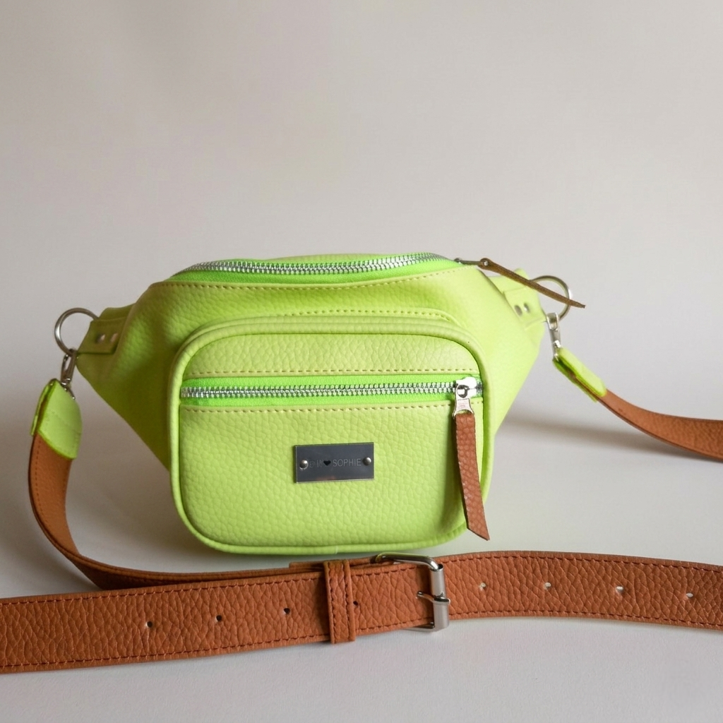 ¡Dale un subidón de color a tu outfit con la riñonera Sophie en tono lima + marrón!